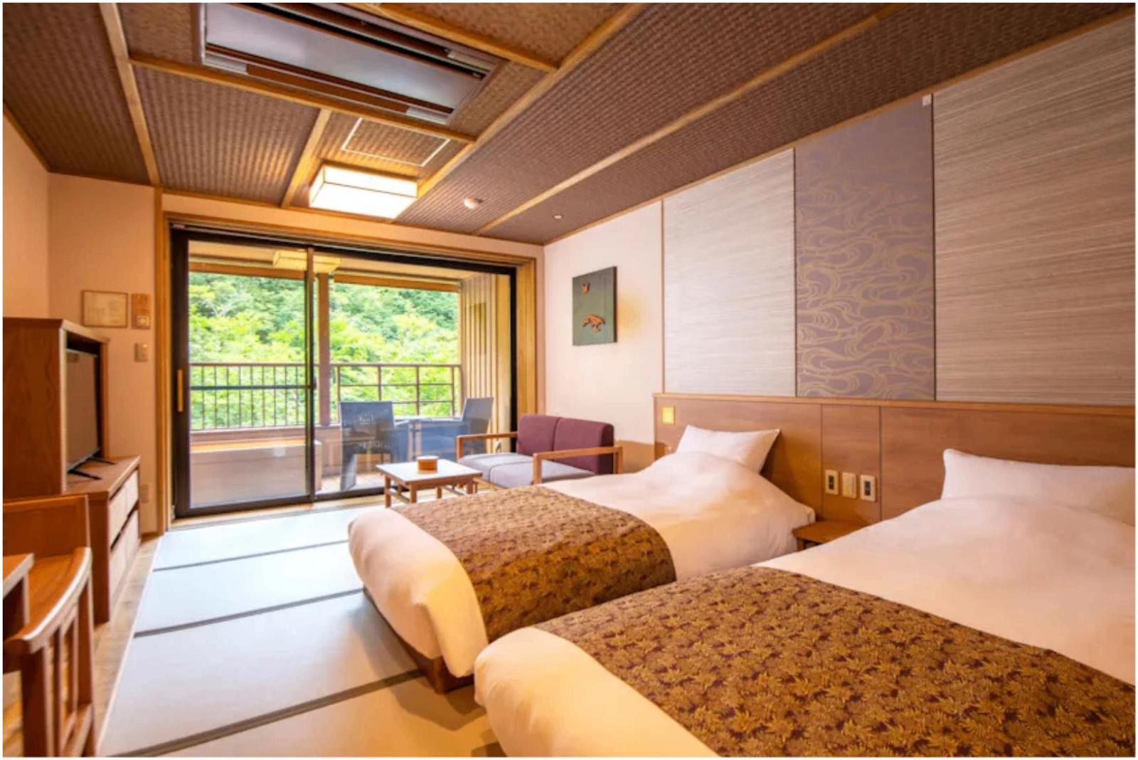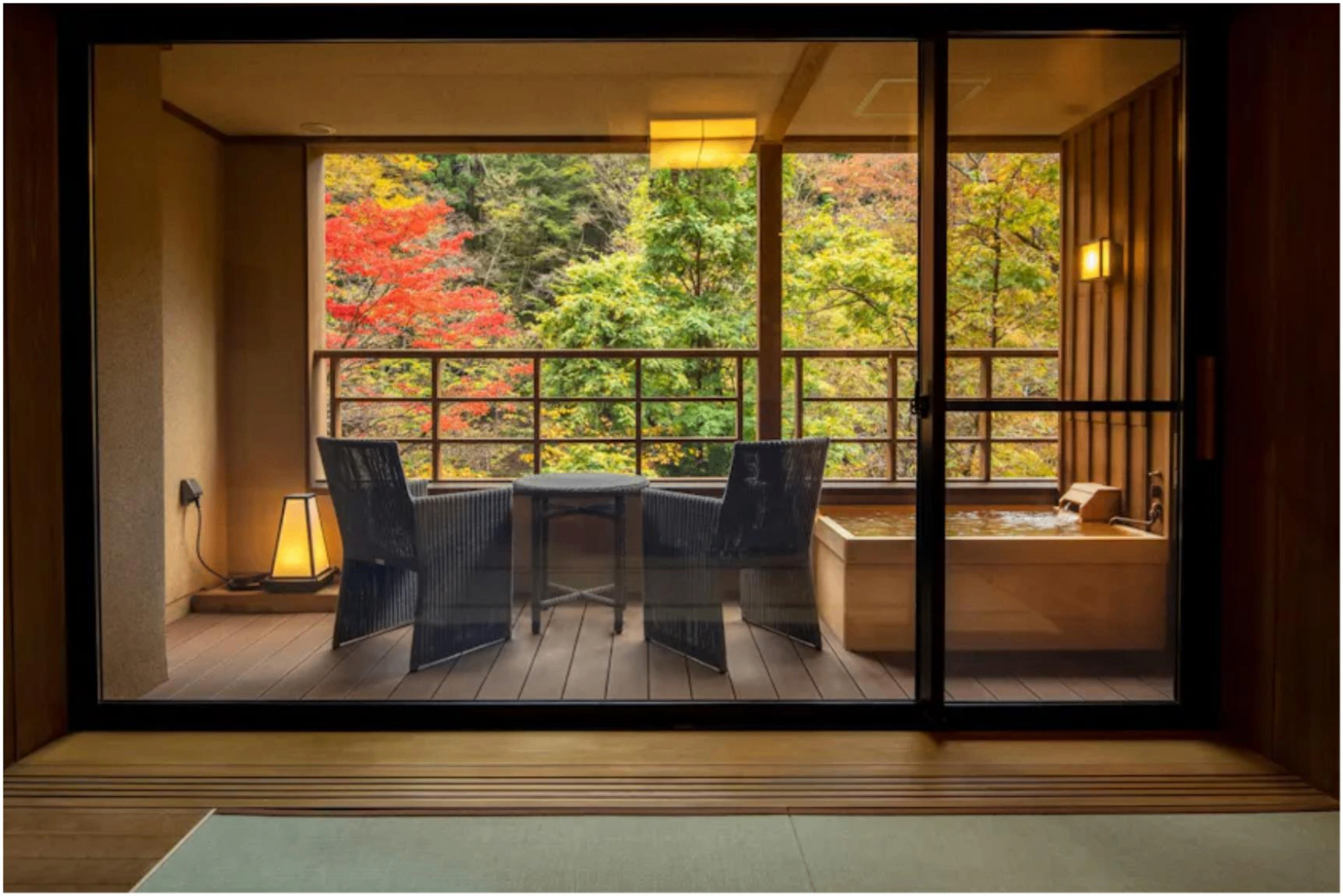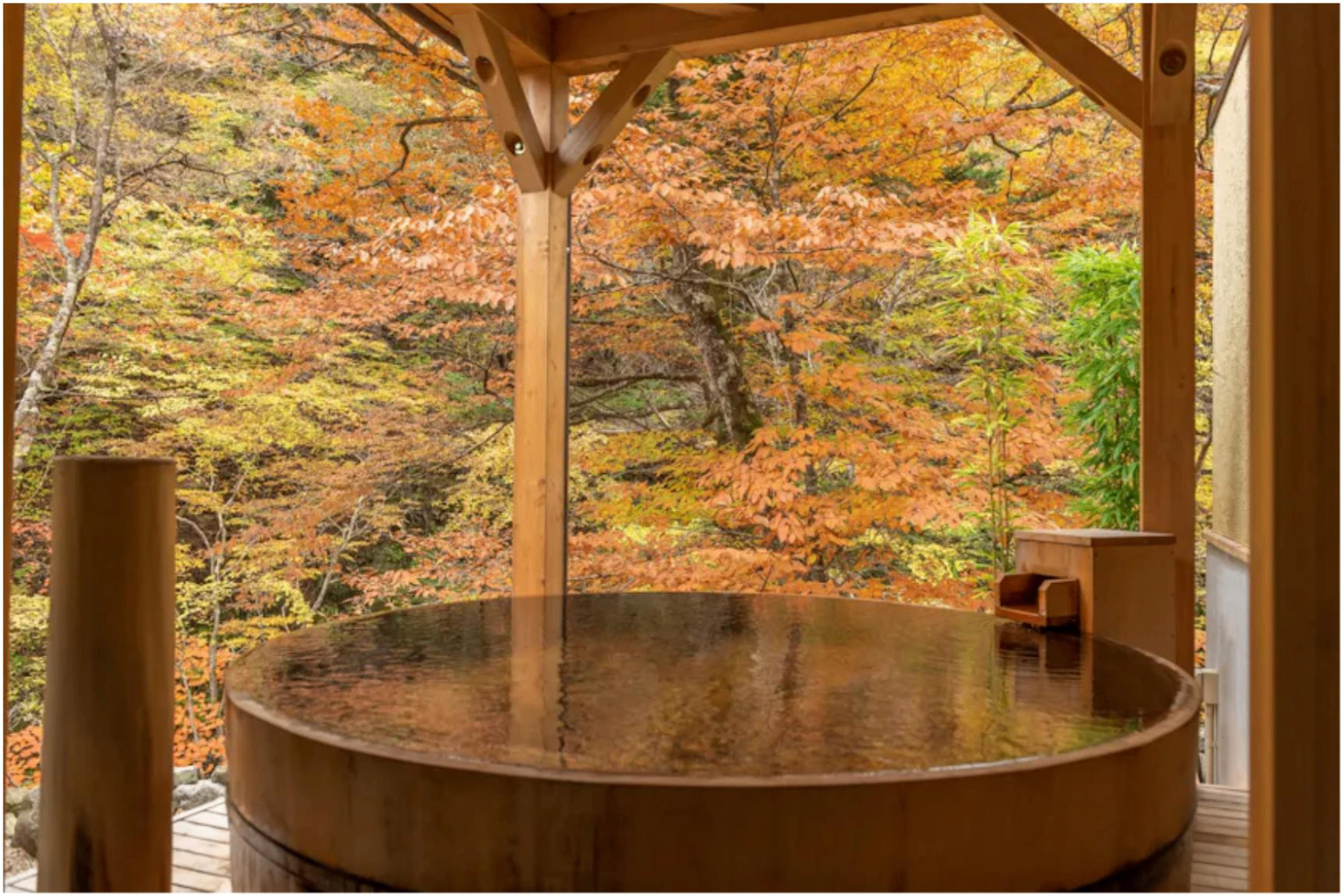 宾馆位于日本著名的避暑胜地-那須高原,宾馆坐落于落差约为30米的盐原溪谷。